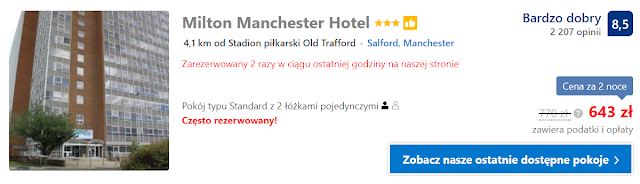 Oferujemy kwatery oddalone nieznacznie od stadionu Old Trafford. Rezerwacje obowiązują w dniach 27-29 kwietnia. Pierwszy z nich to Milton Manchester Hotel, w którym nocleg kosztuje 645 zł za jedną oraz 643 zł za dwie osoby (ok. 161 zł os./noc).