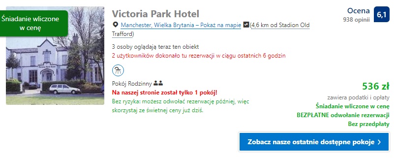 W przypadku dwóch noclegów w Manchesterze proponujemy Trivelles Belforte Hotel gdzie za pokój dwuosobowym zapłacimy 852 zł (213 zł/os./noc). Jeden nocleg możemy zarezerwować w Victoria Park Hotel gdzie za noc ze śniadaniem zapłacimy 536 zł ( 268 zł/os./noc)