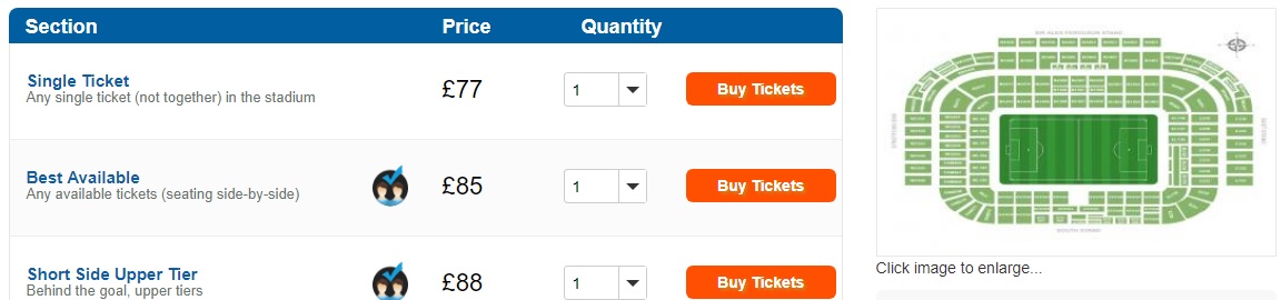 Najtańsze pojedyncze wejściówki zakupimy na rynku wtórnym, gdzie ich cena wynosi 101£ (ok. 495 zł). Większość biletów wysyłana jest wyłącznie na terenie Wielkiej Brytanii. Zalecamy poinformować hotel lub znajomego u którego będziemy nocować o nadejściu przesyłki. REZERWUJ====>