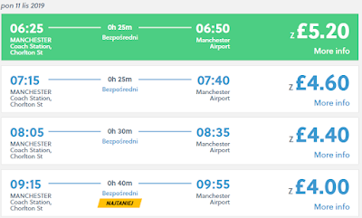 Przejazd z lotniska w Manchesterze do centrum i z powrotem zapewni nam przewoźnik National Express, a ceny podróży w jedną stronę rozpoczynają się od 4 GBP (ok. 20 zł) REZERWUJ====> . Z Liverpoolu do Manchesteru również dotrzemy tym przewoźnikiem od 1.80 GBP (ok. 9 zł) REZERWUJ====>, a z lotniska w Liverpoolu do centrum miasta Beatlesów dowiezie nas komunikacja miejska (linie 86A i 500) za 2,30 GBP (ok. 12 zł).