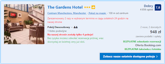 W ścisłym centrum miasta polecamy The Gardens Hotel. Tutaj za jedną osobę zapłacimy 909 zł, a za dwie osoby 948 zł. Ponadto strona booking.com oferuje bezpłatny przejazd taksówką z lotniska w Manchesterze do obiektu od kwoty 801 zł za nocleg, z czego można jak najbardziej można skorzystać w tym przypadku.