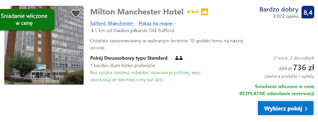 Alternatywą może być zlokalizowany niecałe pięć kilometrów od stadionu Old Trafford Milton Manchester Hotel. Koszt noclegu w terminie 13-15 września dla jednej/dwóch osób ze śniadaniem wynosi 692/736 zł (184 zł os./noc).