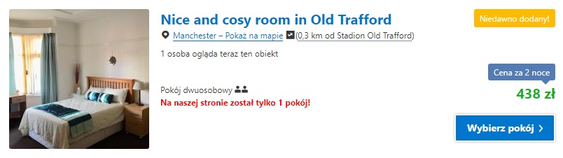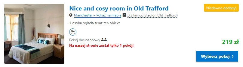 Proponujemy nocleg w Milton Manchester Hotel gdzie za noc w pokoju dwuosobowym zapłacimy 166 zł (83 zł os./noc) lub w Nice and cosy room in Old Trafford położonym bardzo blisko stadionu jednak w dalszym ciągu bez oceny klientów, gdzie za noc w pokoju dwuosobowym zapłacimy 219 zł (ok. 110 zł os./noc). W przypadku dwóch noclegów możemy skorzystać ponownie z Nice and cosy room in Old Trafford w cenie 438 zł w pokoju dwuosobowym ( ok. 110 zł os./noc).