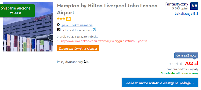 Dla osób, którym zależy na porannym wylocie do Polski z Liverpoolu oferujemy Hampton by Hilton Liverpool John Lennon Airport. Obiekt zlokalizowany jest 200 metrów od lotniska w Liverpoolu, a za nocleg w pokoju dwuosobowym wraz ze śniadaniem zapłacimy 702 zł (ok. 176 zł os./noc).