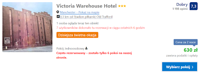 Dla najbardziej zagorzałych kibiców Czerwonych Diabłów polecamy Victoria Warehouse Hotel znajdujący się 300 metrów od stadionu Old Trafford. Cena za nocleg w dniach 15-17 marca wynosi 630 zł za jedną oraz 905 zł za dwie osoby (ok. 227 zł os./noc).