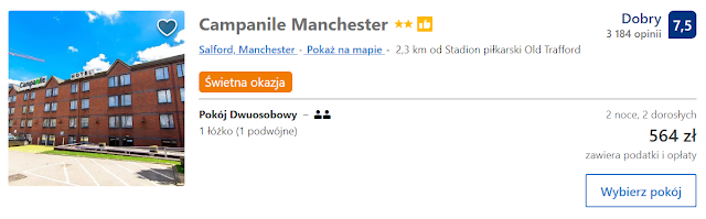 Mniej zapłacimy za pobyt w Campanile Manchester. Koszt noclegu w pokoju jedno/dwuosobowym wynosi 637 zł/564 zł (141 zł os./noc).
