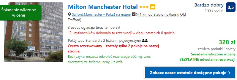 W terminie 29-31.03.2019 proponujemy nocleg w Trivelles Hotel-Manchester-Eccles New Road gdzie za dwie noce w pokoju dwuosobowym zapłacimy 566 zł (ok. 142 zł/os./noc). W przypadku jednego noclegu proponujemy obiekt Milton Manchester Hotel gdzie za noc w pokoju dwuosobowym ze śniadaniem zapłacimy 328 zł ( 164 zł/os.)