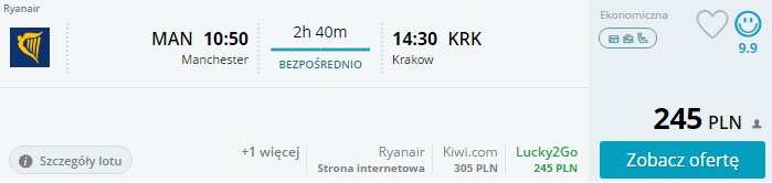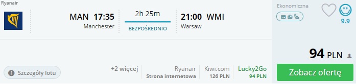 Powrót planujemy dzień po meczu z Manchesteru do Warszawy za 94 zł REZERWUJ ==== >, do Wrocławia za 94 zł REZERWUJ ==== >,  lub z braku bezpośrednich połączeń do Katowic, wylot do Krakowa za 245 zł REZERWUJ ==== >.