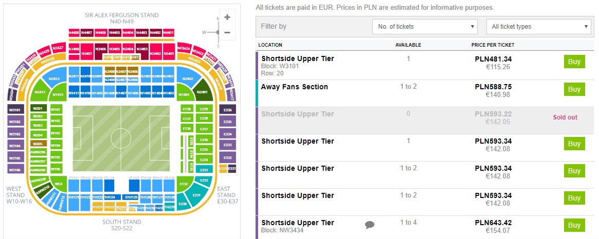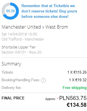 Obecnie wejściówki dostępne są za pośrednictwem rynku wtórnego. Za bilet zapłacimy już od ok. 564 zł (cena na stronie może różnić się nieznacznie, zależy to od kursu walut w danym banku) REZERWUJ ==== >. Uwaga! Bilet wysyłany jest drogą pocztową wyłącznie na terenie Wielkiej Brytanii. Proponujemy powiadomić hotel lub znajomego, u którego będziemy nocować o nadejściu przesyłki. Nie przechodzimy na polską wersję (Stubhub) a pozostajemy w angielskiej wersji strony (ticketbis.net) – znajdziemy tam zdecydowanie tańsze bilety!