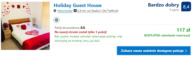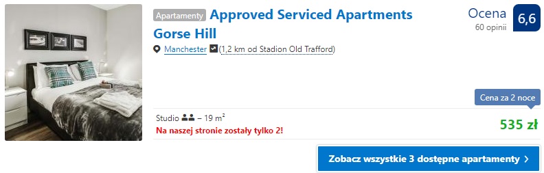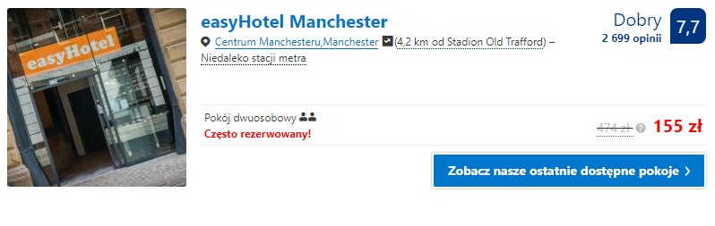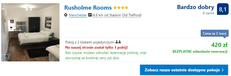Proponujemy nocleg w czterech miejscach położonych niedaleko stadionu. Pierwszym jest Approved Serviced Apartments Gorse Hill (niżej oceniony przez klientów, ale z rewelacyjną lokalizacją) gdzie za dwie noce w pokoju dwuosobowym zapłacimy 535 zł ( ok. 134 zł os./noc). Kolejną propozycją jest Rusholme Rooms (wysoko oceniony przez klientów, bez prywatnej łazienki) gdzie za dwie noce w pokoju dwuosobowym zapłacimy 420 zł ( 105 zł os./noc). W przypadku jednego noclegu proponujemy Holiday Guest House (wysoko oceniony, bez prywatnej łazienki) gdzie za noc w pokoju dwuosobowym zapłacimy 117 zł ( ok. 59 zł os./noc) lub easyHotel Manchester gdzie za noc w pokoju dwuosobowym zapłacimy 155 zł ( ok. 128 zł os./noc)