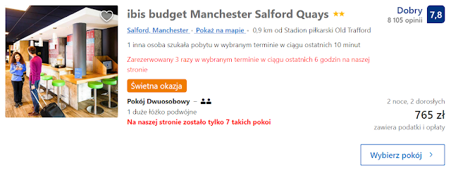 Inną opcją jest ibis budget Manchester Salford Quays. Tutaj za pobyt zapłacimy 823 zł za pokój jednoosobowy oraz 765 zł za pokój dwuosobowy (ok. 191,5 zł os./noc).