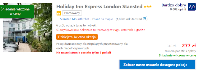 Dla odlatujących z portu lotniczego Londyn Stansted polecamy Holiday Inn Express London Stansted. Tutaj nocleg w tym samym terminie, w pokoju dwuosobowym ze śniadaniem kosztuje 277 zł (138, 5 zł os./noc).