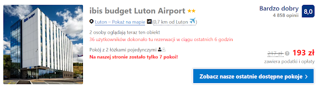 Proponujemy pobyt w ibis budget Luton Airport. Koszt noclegu w dniach 2-3 marca wynosi 217 zł za jedną osobę wraz ze śniadaniem oraz 193 zł za dwie osoby (96,5 zł os./noc).
