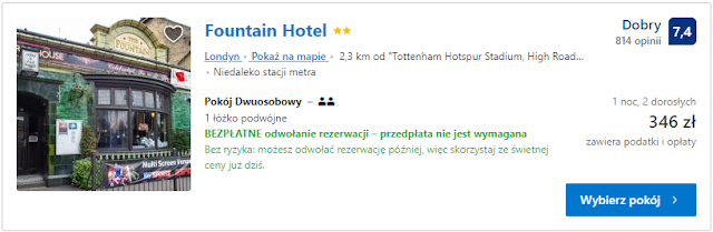 W okolicach nowoczesnego stadionu gospodarzy możemy polecić Fountain Hotel. Tutaj za jedną dobę noclegową w interesującym nas terminie zapłacimy 329 lub 346 zł odpowiednio za jedną lub dwie osoby.