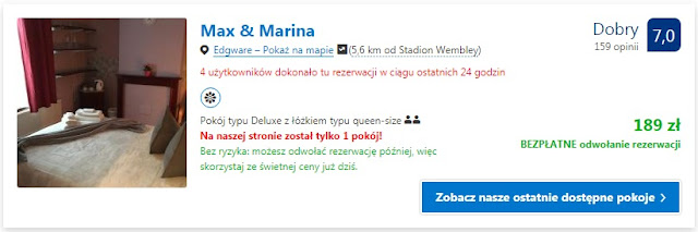 Proponujemy pobyt w miejscach nieopodal stadionu Wembley. Za nocleg dla dwóch osób w Max&Marina zapłacimy 189 zł (95 zł/os/noc). Druga możliwość to Acton Lodge Guest House, gdzie dwuosobowy pokój na jedną noc kosztuje 245 zł (123 zł/os/noc).
