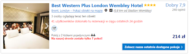 Na miejsce noclegu proponujemy hotel The Greenwood Hotel – Wetherspoon, gdzie za pokój zapłacimy 185 zł (93/os.) lub Euro-Wembley, gdzie za pokój 2-osobowy zapłacimy 200 zł (100/os.) lub Best Western Plus London Wembley Hotel, gdzie za pokój 2-osobowy zapłacimy 214 zł (107/os.)