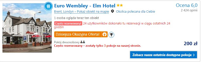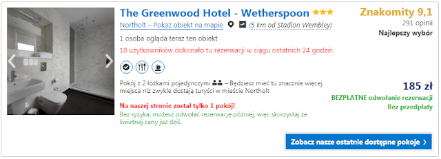 Na miejsce noclegu proponujemy hotel The Greenwood Hotel – Wetherspoon, gdzie za pokój zapłacimy 185 zł (93/os.) lub Euro-Wembley, gdzie za pokój 2-osobowy zapłacimy 200 zł (100/os.) lub Best Western Plus London Wembley Hotel, gdzie za pokój 2-osobowy zapłacimy 214 zł (107/os.)