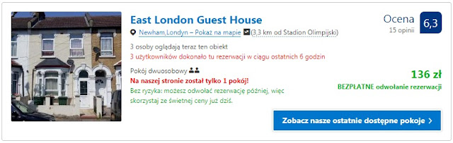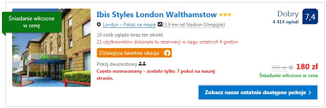Przy opcji z pobytem dłuższym i noclegu na jedną noc proponujemy dwie opcje: East London Guest House za 136 zł dla dwóch osób (68 zł/os/noc) oraz ibis Styles London Walthamstow za 180 zł dla dwóch osób (90 zł/os/noc).