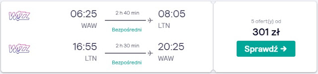 W propozycji umieszczamy bezpośrednie przeloty w obie strony w dniach 29.02-01.03. Do i z portu Londyn Luton dostaniemy się z/do Warszawy za 172 zł* (cena regularna 301 zł) REZERWUJ====>, Krakowa za 212 zł* (cena regularna 306 zł) REZERWUJ====> oraz Wrocławia za 232 zł* (cena regularna 318 zł) REZERWUJ====>
