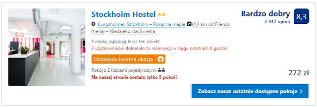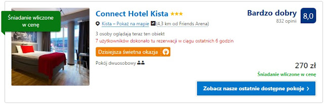 Zarówno w przypadku pobytu na jedną, jak i dwie noce proponujemy dwie opcje noclegowe. Pierwsza z nich to Connect Hotel Kista za 270 zł (135 zł/os/noc) [w przypadku pobytu na dwie noce 540 zł dla dwóch osób]. Inna opcja, w podobnej cenie to Stockholm Hostel za 272 zł (136 zł/os/noc) [w przypadku pobytu na dwie noce 583 zł dla dwóch osób].