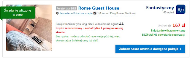 Istnieją dwie możliwości noclegu na jedną noc nieopodal King Power Stadium. Pierwsza z nich to Rome Guest House za 167 zł (84 zł/os/noc). Inna opcja to Grafton House za 198 zł dla dwóch osób (99 zł/os/noc).