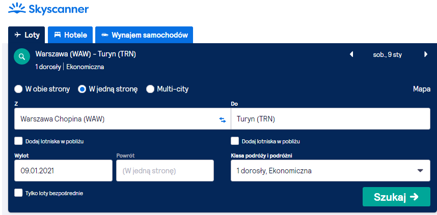 Do wyszukania odpowiedniego lotu proponujemy posługiwać się wyszukiwarkami typu Skyscaner.
