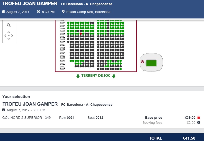 Bilety do kupienia na oficjalnej stronie FC Barcelony -> https://tickets-fcb.fcbarcelona.com/fcb_joangampertickets/en_US/entradas/evento/9608/session/536866/select?_ga=2.139282163.1104900384.1499976895-1748487239.1495552400 gdzie za najtańsze bilety zapłacimy wraz z opłatą rezerwacyjną 41,5€ (ok. 177zł). Bilety wybieramy z planu stadionu.