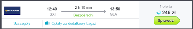 Inną z opcji dotarcia do Glasgow może być lot z portu w Berlinie. Z lotniska Berlin Schonefeld dzień przed spotkaniem 09.09 mamy lot o godzinie 12:40 liniami Ryanair na miejscu jesteśmy 10 min. przed godziną 14:00 a za lot płacimy 246 zł zarezerwuj TUTAJ=====>. Z polski do Berlina dotrzemy liniami autobusowymi PolskiBus przykładowo ze Szczecina koszt przejazdu to 29 zł zarezerwuj TUTAJ=====>, Poznania od 35 zł zarezerwuj TUTAJ=====> a z Wrocławia od 69 zł zarezerwuj TUTAJ=====>.