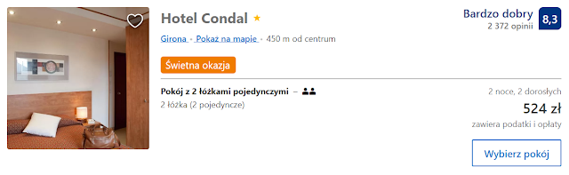 Alternatywą może być Hotel Condal. Za nocleg w pokoju jedno/dwuosobowym zapłacimy 447 zł/524 zł (131 zł os./noc).