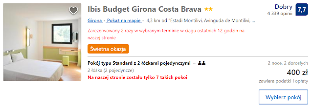 Proponujemy dwudniowy pobyt w Ibis Budget Girona Costa Brava, w którym koszt noclegu wynosi 430 zł za jedną oraz 400 zł za dwie osoby (100 zł os./noc).