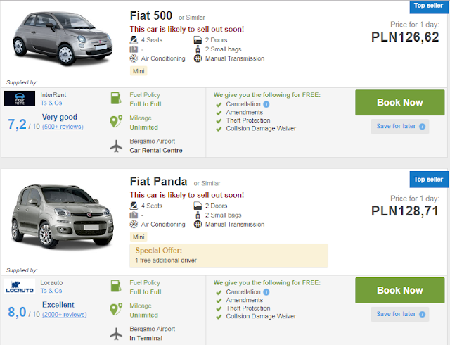 Dla ceniących sobie swobodę w poruszaniu się po mieście a także między miastami (Bergamo – Mediolan) proponujemy wynajem auta. Możemy wskazać dowolne miejsce odbioru i zwrotu auta (również lotnisko). Ceny za wynajem czteroosobowego auta za jeden dzień zaczynają się od ok. 127 zł (ok. 32 zł na osobę w przypadku grupy czteroosobowej) REZERWUJ====>