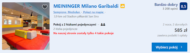 Proponujemy pobyt w obiektach, które znajdują się niedaleko stadionu San Siro. Pierwszy z nich to MEININGER Milano Garibaldi, który oferuje dwudniowy nocleg w cenie 525 zł (pokój jednoosobowy) oraz 585 zł (pokój dwuosobowy, ok. 146,5 zł os./noc).