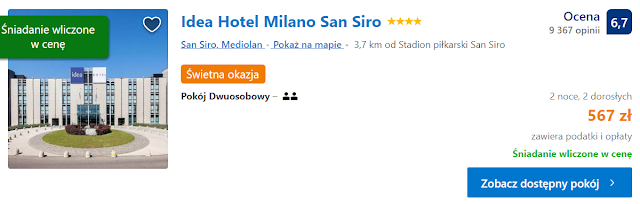 Alternatywnym wyborem może być Idea Hotel Milano San Siro. Za pobyt w terminie 1-3 lutego w pokoju jedno/dwuosobowym zapłacimy 564 zł/567 zł (ok. 142 zł os./noc).