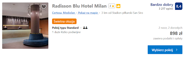 Dla fanów przylatujących do Włoch dzień wcześniej polecamy Radisson Blu Hotel Milan. Cena za dwudniowy pobyt wynosi 933 zł dla jednej oraz 898 zł za dwie osoby (224,5 zł os./noc).