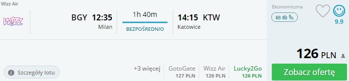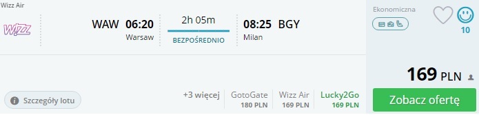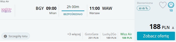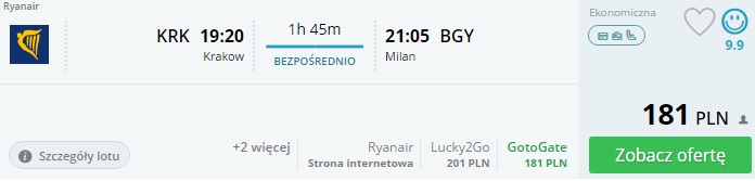 Proponujemy wylot dzień przed meczem z Gdańska do Mediolanu za 120 zł REZERWUJ ==== >, lub z Krakowa za 181 zł REZERWUJ ==== >. W dniu meczu możemy wylecieć z Warszawy za 124 zł*(cena regularna 169zł) REZERWUJ ==== >