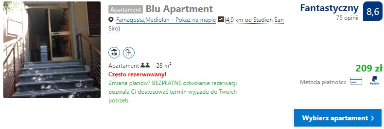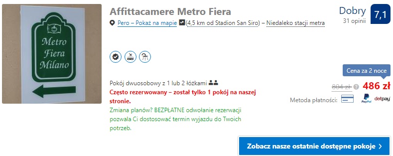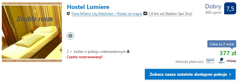 W przypadku dwuosobowego noclegu w terminie 14-16 kwietnia proponujemy Affittacamere Metro Fiera w cenie 502 zł ( ok. 126 zł os./noc – w cenę wliczony podatek miejski). W przypadku jednego noclegu dla dwóch osób w terminie 15-16 kwietnia proponujemy Blu Apartment w cenie 251 zł (ok. 126 os./noc -w cenę wliczony podatek miejski oraz opłata za prąd). Za dwuosobowy nocleg w terminie 15-17 kwietnia w Hostel Lumiere zapłacimy 410 zł ( ok. 103 zł os./noc – w cenę wliczony podatek miejski).