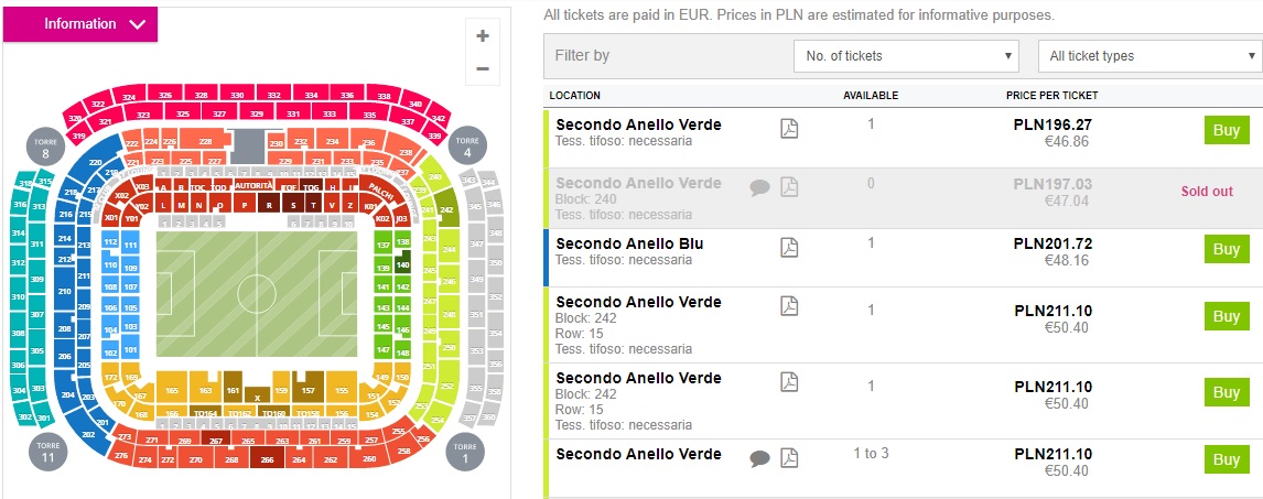 Bardzo prawdopodobne, że wejściówki na mecz trafią do otwartej sprzedaży w późniejszym terminie, za pośrednictwem strony internetowej AC Milan . Na tą chwilę wejściówki na mecz kupimy na rynku wtórnym, a za najtańsze bilety nie wymagające posiadania kart TESSERA DEL TIFOSO zapłacimy ok. 236 zł ( cena zależy od kursu waluty w danym banku). Bilet zostanie dostarczony w formacie elektronicznym, do wydrukowania. Nie przechodzimy na polską wersję (Stubhub) a pozostajemy w angielskiej wersji strony (ticketbis.net) – znajdziemy tam zdecydowanie tańsze bilety! REZERWUJ ===>