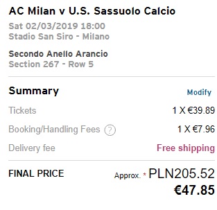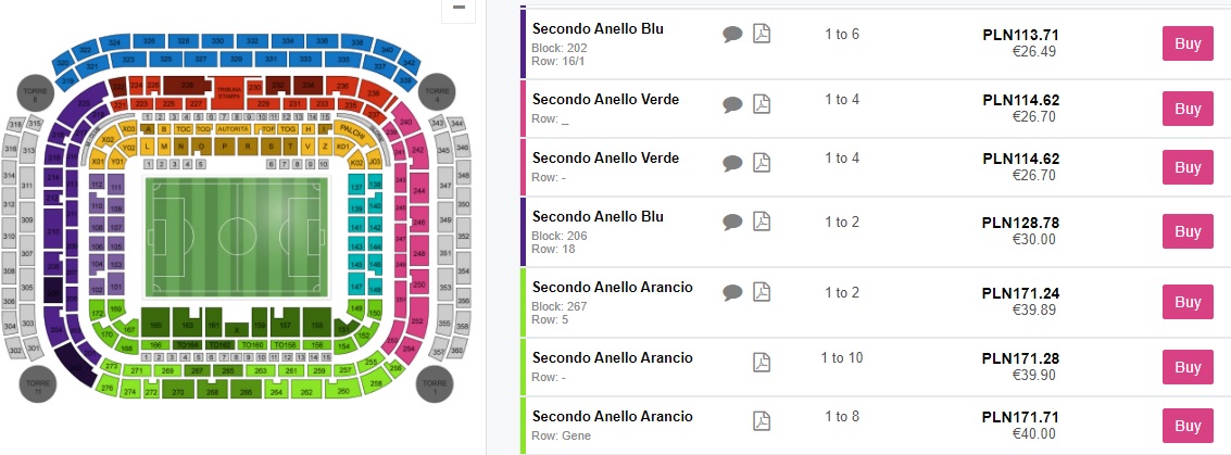 Najtańsze wejściówki na dzień dzisiejszy zakupimy na rynku wtórnym. Za pojedynczy bilet bez konieczności posiadania karty Tessera Tifoso zapłacimy ok. 206 zł. REZERWUJ====>