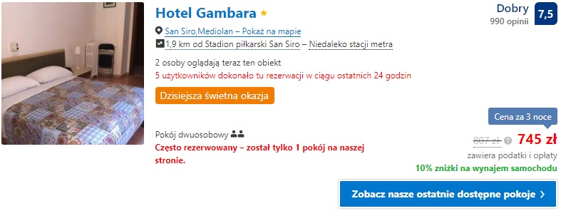 W terminie 1-3.03.2019 proponujemy nocleg w oddalonym nieznacznie od stadionu obiekcie Hotel Nuovo Murillo, gdzie za dwie noce w pokoju dwuosobowym zapłacimy 546 zł ( ok .137 zł/os./noc). W terminie 1-4.03.2019 proponujemy nocleg w obiekcie Hotel Gambara, gdzie za trzy noce w pokoju dwuosobowym zapłacimy 745 zł ( ok. 125 zł/os./noc).