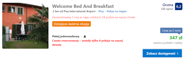 Alternatywą może być znajdujący się znajdujący się w promieniu 2 km od lotniska w Pizie Welcome Bed And Breakfast. Cena za nocleg w dniach 10-12 maja wynosi 361 zł* za pokój jednoosobowy oraz 458 zł* za pokój dwuosobowy (114,5 zł os./noc).