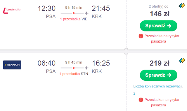 Powrót do kraju rezerwujemy na 12 maja. Oferujemy lot z Pizy do Krakowa za 146 zł (z przesiadką w Wiedniu) REZERWUJ====> lub z przesiadką w Londyn Stansted za 219 zł REZERWUJ====>.