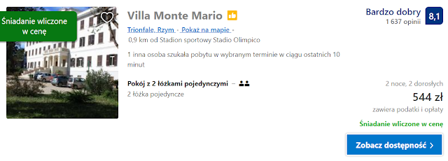Oferujemy obiekty zlokalizowane nieopodal Stadionu Olimpijskiego. Pierwszy z nich to Villa Monte Mario. Za dwudniowy nocleg ze śniadaniem zapłacimy 467 zł za jedną oraz 544 zł za dwie osoby (136 zł os./noc).