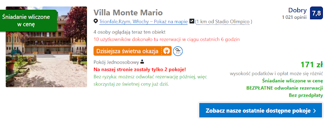 Polecamy nocleg w Villa Monte Mario, który jest zlokalizowany kilometr od Stadio Olimpico. Koszt noclegu wraz ze śniadaniem wynosi 171 zł za pokój jednoosobowy i 214 zł (107 zł os./noc) za dwuosobowy.