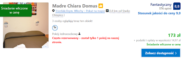 Proponujemy nocleg w Madre Chiara Domus, za który zapłacimy 188 zł (jedna osoba) oraz 281 zł (dwie osoby/ 140,5 zł os./noc). W cenę wlicza się śniadanie. Inną opcją może być Roema Guest House, gdzie koszt noclegu w pokoju jednoosobowym wynosi 181 zł oraz 325 zł za dwuosobowy (162,5 zł os./noc).