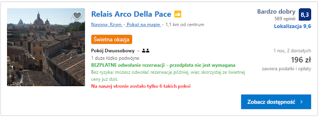 Z kolei w świetnej lokalizacji blisko centrum miasta znajduje się bardzo dobrze oceniany Relais Arco Della Pace. Pobyt w tym obiekcie na jedną dobę to koszt 196 zł dla dwóch osób i 181 zł dla jednej osoby.