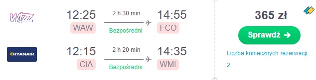 Proponujemy zakup biletów lotniczych w dwie strony z Warszawy do Rzymu i z powrotem w dniach 25-27.12.2018 r. Za przelot w dwie strony zapłacimy 365 zł REZERWUJ====>.