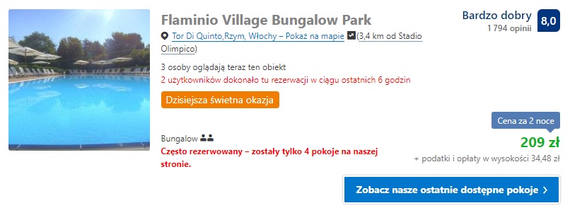 Proponujemy nocleg w niezwykle klimatycznym obiekcie, z bardzo dobrymi opiniami klientów jakim jest Flaminio Village Bungalow Park, gdzie za dwie noce w pokoju dwuosobowym, ze wszystkimi dodatkowymi opłatami zapłacimy 244 zł ( 61 zł/os./noc).