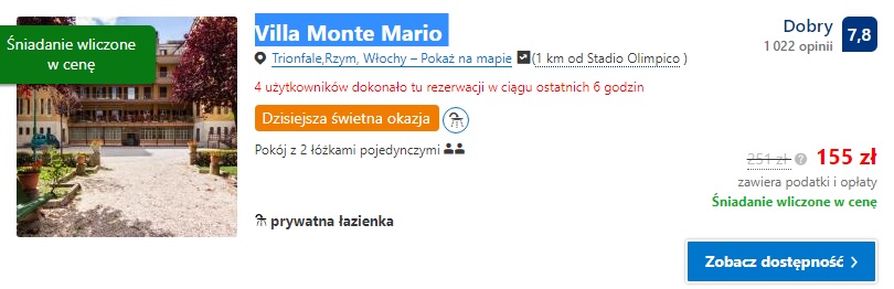 Proponujemy nocleg w obieckie Villa Monte Mario gdzie za noc w pokoju dwuosobowym ze śniadaniem zapłacimy 155 zł ( ok. 78 zł/os.)