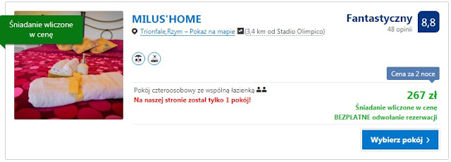 Proponujemy nocleg w dwóch miejscach nieopodal Stadio Olimpico w Rzymie. Pierwsza opcja to Mary Anne, gdzie dwie noce dla dwóch osób kosztują 233 zł (ok. 59 zł/os/noc). Inna możliwość to pobyt w Milus’home, za który zapłacimy 267 zł (ok. 67 zł/os/noc).