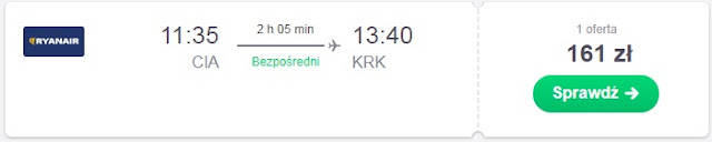Powrót do Polski proponujemy 10.03, za lot z Rzymu do Krakowa zapłacimy 161 zł REZERWUJ====>, inną możliwością jest lot do Warszawy za 174 zł REZERWUJ====>